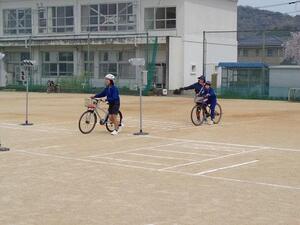 - 高学年以上の児童を対象とした自転車教室では、自転車の正しい乗り方や点検方法を学んだうえで、運動場に設定したコースを走行して交通ルールや安全確認の方法等を指導しています。