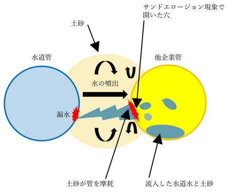 サンドエロージョン(サンドブラスト)現象とは、水道管の漏水によって発生した水流が周辺の土砂を巻き込み、水と土砂が混合した状態で他埋設管に継続的に衝突して管体を減耗させ、孔を開ける現象である。