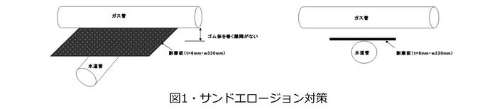 サンドエロージョン現象によるガス供給支障事故防止施工方法(ゴム板および耐摩板による防護)
