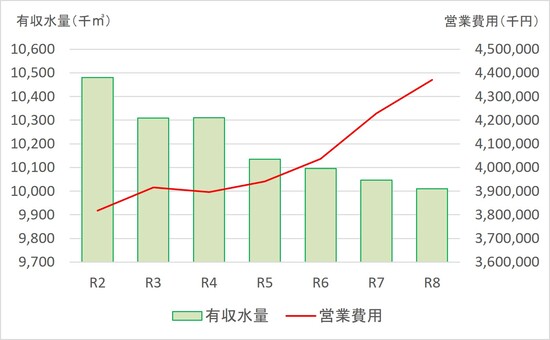また、物価やエネルギー価格の上昇により維持管理費が増加している一方で、人口減少や節水意識の高まりにより有収水量(料金を請求できた水量)が減少しています。