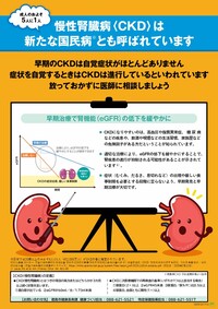 また、慢性腎臓病(CKD)は自覚症状に乏しく、知らず知らずのうちに腎機能が低下し、進行すると末期腎不全に至り人工透析が必要となります。しかし、適切な生活習慣や健診等による早期発見や診断、治療を行うことで重症化の予防は可能です。