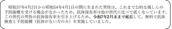 令和7年2月末をもって風しん抗体検査については終了しました。 ただし、令和7年3月31日までに抗体検査を行ったにもかかわらず、ワクチン供給の都合により予防接種を受けられなかった人の予防接種は、令和9年3月31日まで延長となりました。