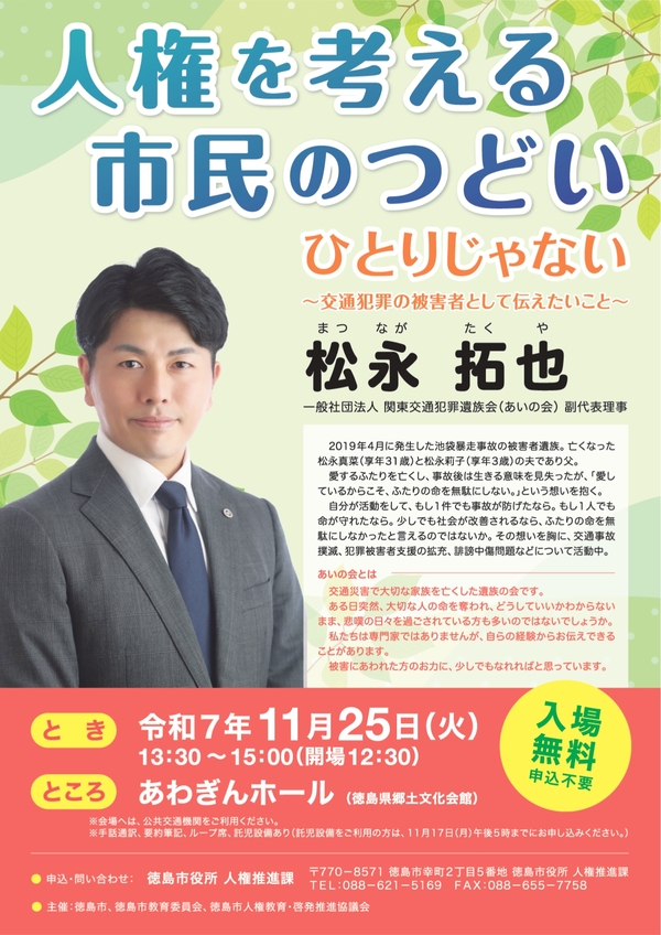 松永拓也さんは、池袋暴走事故で愛するふたりを亡くされ、事故後は生きる意味を見失われましたが、「愛しているからこそ、ふたりの命を無駄にしない。」という想いを抱き、自分が活動することで、「もし1件でも事故が防げたなら。もし1人でも命が守れたなら。少しでも社会が改善されるなら、ふたりの命を無駄にしなかったと言えるのではないか。」その想いを胸に、交通事故撲滅、犯罪被害者支援の拡充、インターネットやSNS等での誹謗中傷問題などについて講演等の活動をされています。