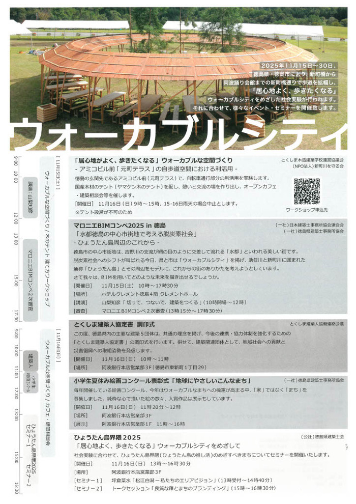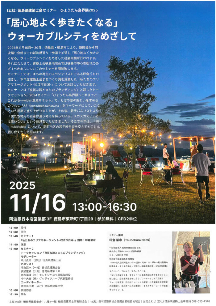 ひょうたん島再考 within 倉庫サミット」を実施した公益社団法人徳島県建築士会徳島支部が、次の資料のとおり、セミナー ひょうたん島界隈2025「居心地よく歩きたくなる」ウォーカブルシティを目指して を開催します。まちづくりの未来を語り合う貴重な機会です。