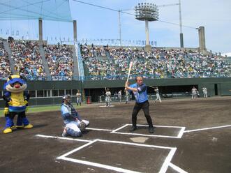 徳島市民応援デーとして開催された徳島インディゴソックスVS阪神タイガース(ファーム)の交流戦に参加した遠藤市長は、「死力を尽くし、全力で戦う選手やスタッフに向けて、力を結集して、徳島インディゴソックスの勝利のため、熱い、熱い応援で、一緒に試合を盛り上げていきましょう!」と挨拶し、始球式では、バッターを務めました。