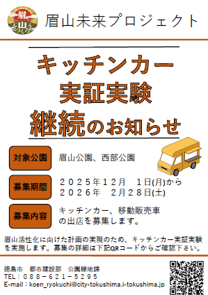 令和7年4月1日から令和7年11月30日までの期間、「眉山未来プロジェクト」の一環として、眉山にキッチンカーを出店する実証実験を実施しておりましたが、令和7年12月1日以降も事業者の募集を継続します。なお、実証実験は試験的な試みのため、公園使用における利用ルールを一部緩和しています。そのため、募集については、必要に応じて内容を見直す場合があります。