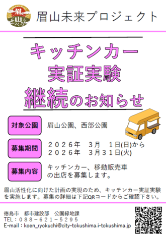 公園緑地課では令和7年4月1日から令和8年2月28日までの期間、眉山活性化に向けた「眉山未来プロジェクト」の一環として、眉山にキッチンカーを出店する実証実験を実施しておりましたが、令和8年3月1日以降も引き続き事業者の募集を継続します。なお、実証実験は試験的な試みのため、公園使用における利用ルールを一部緩和していますので、募集内容については、必要に応じて見直す場合があります。