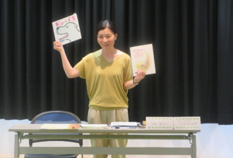 読み聞かせにふさわしい絵本の選び方、読む時の本の位置、持ち方、ページのめくりかた。そして、読むスピードや声の出し方などを、実演を交えながら一つ一つ丁寧に教えてもらいました。読み聞かせのコツを教わった後は、実践の時間です。本の持ち方やめくり方に注意しながら、保護者の方に向けて読み聞かせを行っていました。皆の前で練習の成果を発表してくれたお子さんも!今回の講座で学んだことを活かした読み聞かせに、参加者の皆さんから拍手が起こっていました。