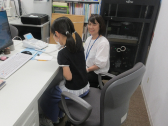 まずは、ミーティングに参加して自己紹介を行います。事務室で電話対応をした後は、館内巡回へ出発。困っている人はいないか来館しているかたの様子を見たり、故障している所はないか設備を確認したりするのも大切なお仕事です。アミコビルの警備室へご挨拶にも行きました。巡回が終わったら、今度は事務作業に挑戦。書類のチェックや新刊本の確認を行います。特に、毎週入ってくる新刊本に興味津々な様子でした。確認した書類に判子を押したら、館長体験は終了です。お仕事お疲れ様でした!