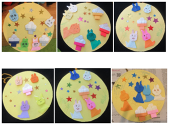 おはなしのへやに拍子木を打つ音が響いた後、徳島市に伝わる「根津のこっつあん松」や、怖いお話「ゆうれい大工」の手作り大型紙芝居が始まりました。次に、昔話「かぐや姫」のうちわシアターを行い、童謡「ゆりかごのうた」や「うさぎ」を皆で歌いました。最後に、工作でお月見の飾りを作りました。子どもたちは、保護者やボランティアのかたと一緒に、好きな色の折り紙で折ったお月見団子やウサギ、星を貼って、思い思いの飾りを完成させ、順番に作品を発表しました。今回も盛沢山のイベントで、参加者の皆さんに楽しんでいただくことができ、あっという間に1時間が過ぎていきました。
