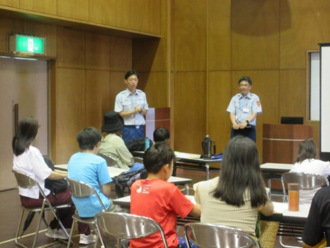 資料を使って部署が分かれていることや、いつでも救助に行けるように24時間体制で勤務にあたっていることなどを説明してもらってから、消防署の探検スタートです!!