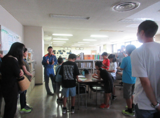 まず最初は通信指令センター。119番通報が掛かってくると電話で症状などを聞きながら即座に判断をしなくてはならないため、とても神経を使う部署です。火災は年々減っていて、年間で約80件ぐらい。それとは反対に、今年の阿波踊り期間中の12~15日だけで救急車の出動件数は89件あったと説明していただくと、みんな「えぇー!!!」と、驚いていました。出動した理由のほとんどが「熱中症」だったそうです。
