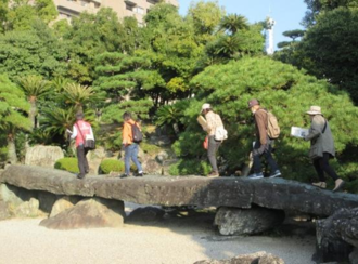 次は旧徳島城表御殿庭園に入りました。枯山水と徳島の名石をふんだんに配置した庭園は厳かな雰囲気でした。初代藩主蜂須賀至鎮公の踏割の伝説がある橋や「心」の字を表現している池のある風景を眺めながら解説を聞きました。