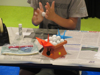 1日目は、ぬいぐるみがおとまりしている間に使う、おつきみ飾りの工作です。