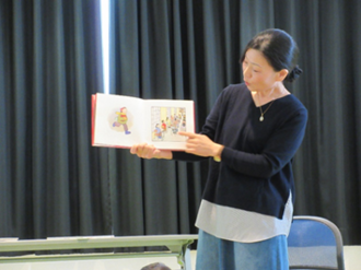 「そらはあおくて」は、何世代にも渡る命のお話。お母さんが女の子に、自分が子どもの頃の遊びや服などの写真を見せながら、時代が変わっても変わらないものについて話します。心が温かくなる絵本の内容に、参加していた子どもたちも優しい表情になっていました。