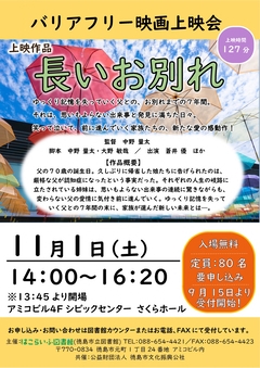 - FAX:088-654-4423へ、「バリアフリー上映会参加」とご記入のうえ、参加されるかたの「お名前(ふりがな)」、「連絡先(電話番号、受信のできるFAX番号)」をお知らせください。