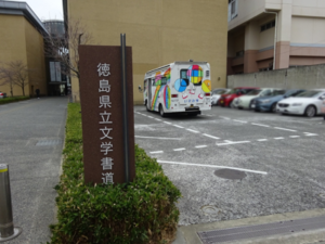 徳島中学校横にある徳島県立文学書道館の駐車場に停車します。